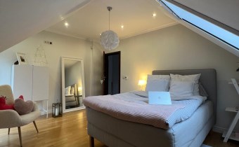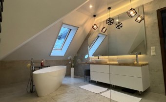 Piętro: trzy sypialnie, łazienka. Przy głównej sypialni znajduje się garderoba oraz pomieszczenie do zagospodarowania (przyłącza do wykonania łazienki).